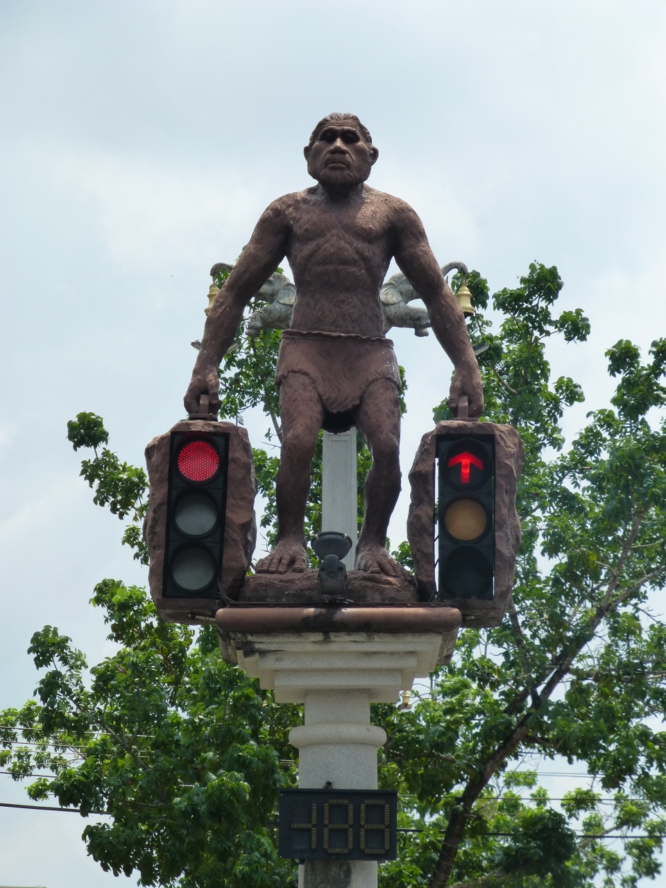タウン自体は100年そこそこの街であるが、 クラビ県内ではいくつかの箇所から最古の原始人の骨が見つかっているのにちなんで作られた原始人信号。