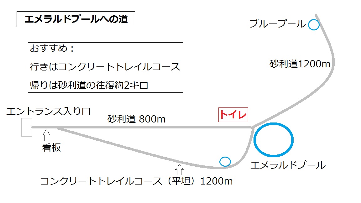 右手のトレイルコースは完全舗装で1,400メートル、まっすぐの砂利道は800メートルでエメラルドプールに着きます。